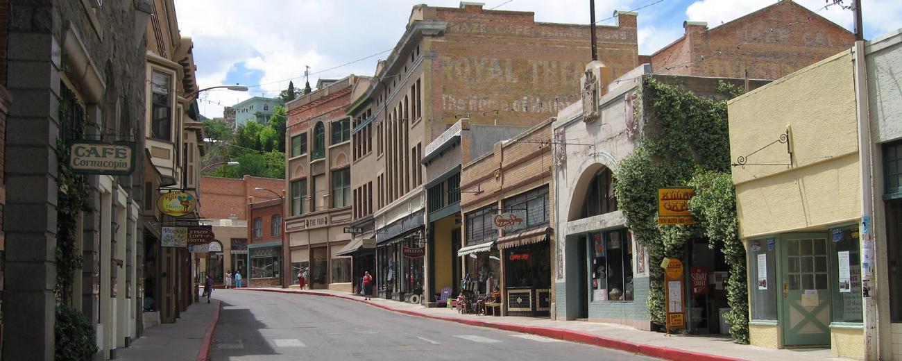 Bisbee, Arizona began as a mining town and although the mines have closed, the town survives, even thrives. Its focus has moved from ore to culture, and the once-mining community has become part artist colony and part retirement community. The history remains, however, and even informs how the town looks today. Its downtown, or "Old Bisbee," preserves Victorian homes and the beautiful Art Deco-style courthouse. Also preserved is Old Bisbee's hilliness - an old high school has a ground-level entrance on each of its three floors.