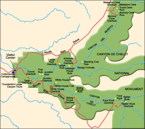 Listed below is information to help you get oriented and better explore Canyon de Chelly National Monument. Whether you take the North or the South Rim Drive you'll get a great idea of the different areas of the park by clicking on the options below.